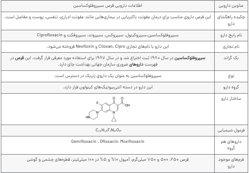 این دارو برای درمان انواع عفونتهای باکتریایی استفاده میشود و در گروه آنتیبیوتیکهای کینولون قرار دارد. قرص سیپروفلوکساسین با متوقف کردن رشد باکتریها، فقط برای درمان این نوع عفونتها مؤثر است. به همین دلیل، نمیتوان آن را برای عفونتهای ویروسی مثل سرماخوردگی یا آنفولانزا استفاده کرد. مصرف آنتیبیوتیکها در شرایطی که نیازی به آنها نیست، میتواند باعث شود در آینده برای درمان عفونتهای دیگر کارایی نداشته باشند. در جدول زیر میتوانید اطلاعات مهم درباره این دارو را مشاهده کنید.